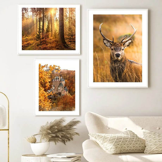 Autumn Forest Deer Pumpkin Leaves Road Large Wall Art