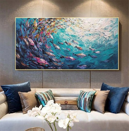 Golden Fish in Abstract Azure Sea By Night Canvas Wall Art