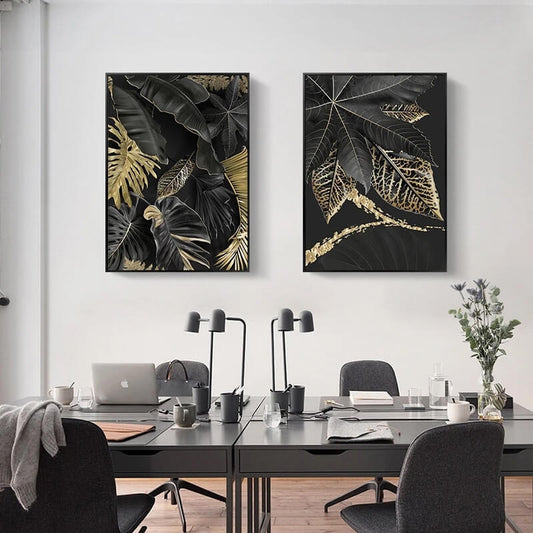 Tropical Golden Leaves Black Canvas Print