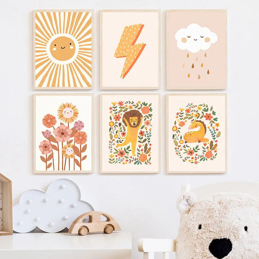 Boho Sun Floral Animal Canvas Prints For Kids Rooms
