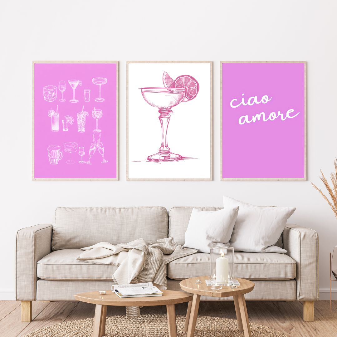 Retro Pink Martini Food and Drink Canvas Print Art Ciao Amore Pink Poster For Kitchen Wall Decor